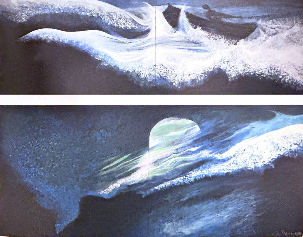 Nei primi anni Ottanta scompaiono dalle sue superfici quei nuclei figurali che si erano consolidati nella produzione precedente senza che Masucci li considerasse soddisfacenti. In un ciclo di marine che chiameremo le « Onde» aleggia la voglia di un nuovo incipit, un rinnovato inizio dal più profondo della vena immaginifica. Appaiono volute d’acqua che si ripiegano nella finzione di onde schiumanti sopra superfici dichiarate per quel che sono, letteralmente piatte. Più che di un frammento, l’onda in primissimo piano è un particolare, un blow-up, un ingrandimento di uno stato coscienziale tra l’attonito e il panico. L’immagine apparentemente astratta si rivela invece un corposo dettaglio della realtà entro cui annegare lo sguardo. Masucci procede con adagio mosso…