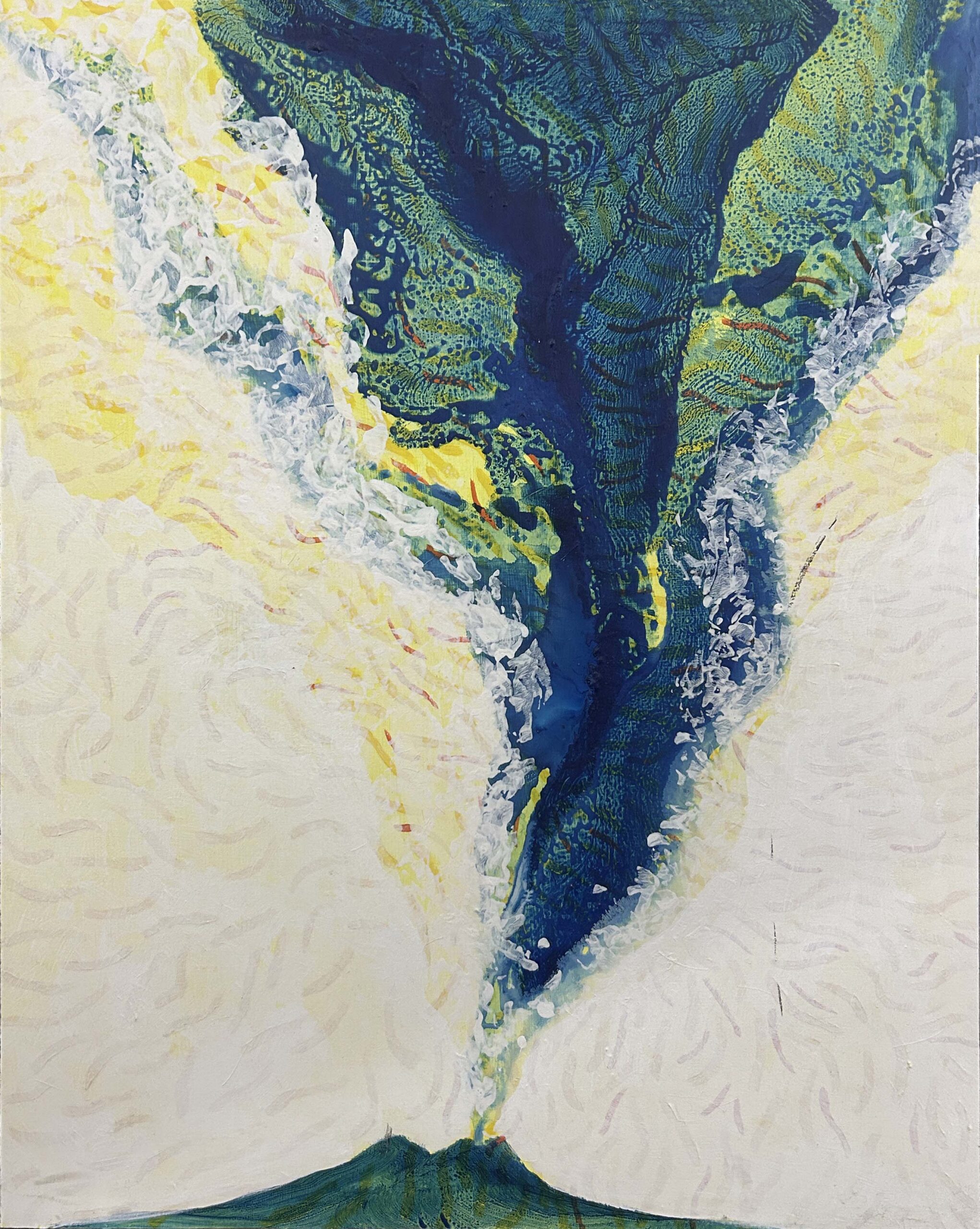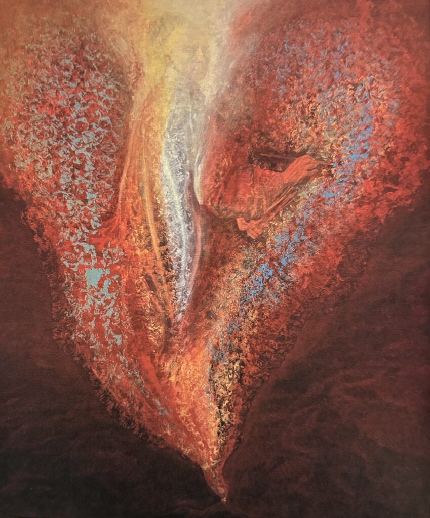 La pittura di Lello Masucci è difficilmente descrivibile e rimanda tanto alle fonti dell’arte quanto alle scaturigini degli stati della coscienza. Una scena straordinaria ritorna sovente nei suoi quadri: quella del magma eruttivo.
